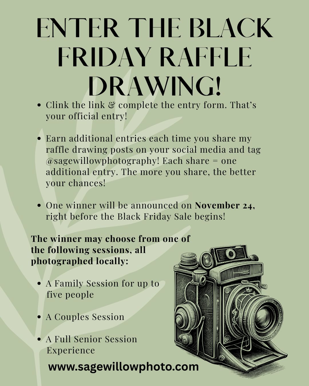 CLICK HERE TO ENTER THE RAFFLE!!! Today’s the day! ✨ The Sage Willow Black Friday Raffle is officially open! One lucky winner will receive a FREE photo session to use in 2026—imagine golden light, easy laughter, and heirloom photographs you’ll hold onto forever. The winner may choose from a Family Session for up to 5 […]